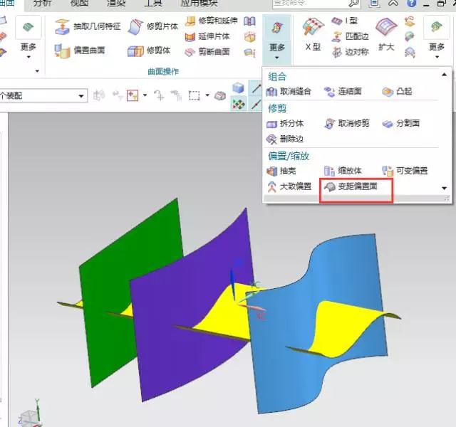 在曲面操作中點(diǎn)擊選項【更多】下拉菜單,找到【變距偏執面】