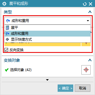 5點(diǎn)擊展平與成形命令 選取成形和重用。 6選擇展平特征