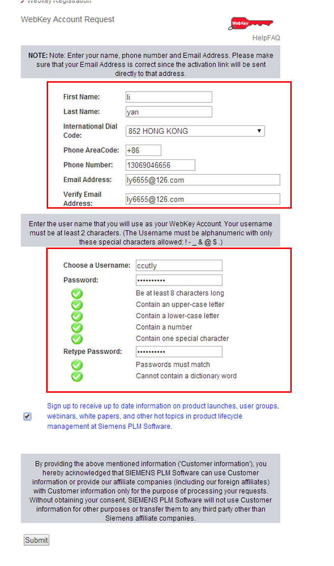 這里需要注意的是賬戶(hù)名就是以后您登陸使用的名字,密碼的要求是要有大小寫(xiě)、特殊字符、數字字符和8位以上的字符。填寫(xiě)好了,點(diǎn)擊submit遞交。