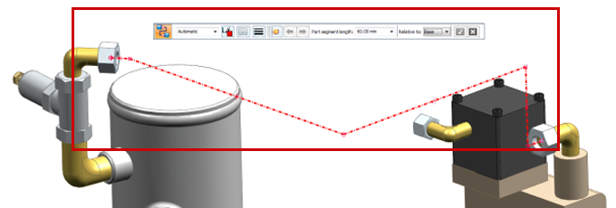 快速布管命令在 3D 草圖環(huán)境中可用,因此可自動(dòng)在兩個(gè)點(diǎn)之間創(chuàng )建 3D 草圖路徑。此命令在 3D 草圖中稱(chēng)為管線(xiàn)路徑,且此命令條包含的選項比標準快速布管命令條要多。在 3D 草圖中使用此命令時(shí),可使用其他選項來(lái)應用顏色和線(xiàn)條樣式,以及創(chuàng )建相對于用戶(hù)定義坐標系的路徑。